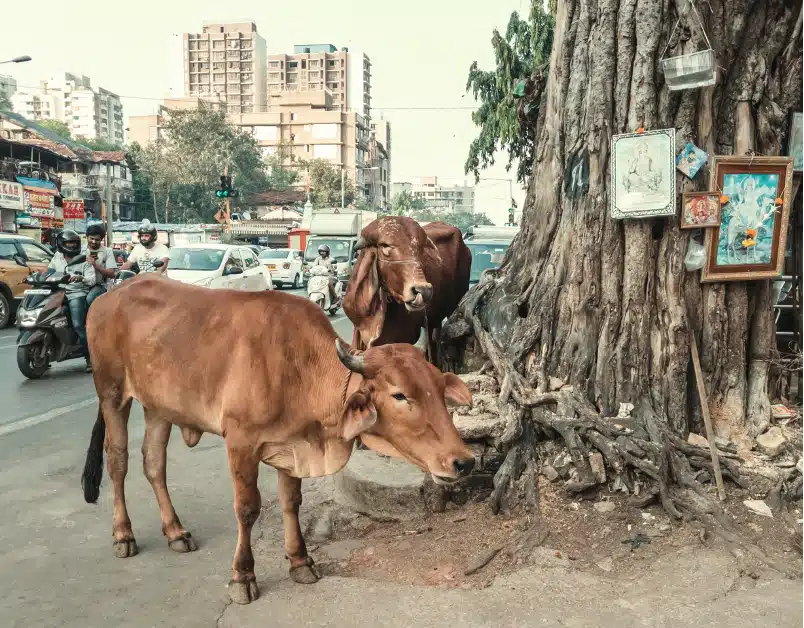 Kühe gehören in Indien ebenso zum Stadtbild wie Motorräder und Rikschas. Da die Tiere in Indien als heilig gelten, haben sie immer einen Vorteil im Straßenverkehr als andere Verkehrsteilnehmer, da sie immer Vorfahrt haben. Diese inoffizielle Verkehrsregel führt jedoch oft zu Staus, außerdem ist es nicht gestattet, die Tiere auf der Straße zu füttern.